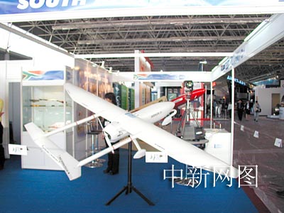 與上屆航展相比,南非的展臺此次增大了許多,但展品還是一樣,白色的是南非生產(chǎn)的無人機。