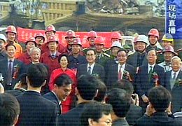 截流儀式結(jié)束后,中央領(lǐng)導一行離開主席臺,走到上游圍堰,接見三峽建設(shè)者并與建設(shè)者代表合影。