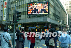 中共十六大11月8日在北京開幕,香港有線電視臺(tái)全程直播。中共中央總書記江澤民作報(bào)告時(shí),正值香港金融心臟中環(huán)一帶緊張的上班時(shí)間,但仍然有不少市民駐足觀看。任晨鳴 攝