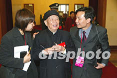 福建代表伍洪祥十日在工作人員的陪伴下參加中國(guó)共產(chǎn)黨第十六次全國(guó)代表大會(huì)分組會(huì)。八十八歲的伍洪祥曾作為代表出席過(guò)中共七大。作者:毛建軍