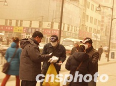 長春市天空一片暗黃,市民紛紛購買口罩以避風(fēng)沙。韓丹 攝