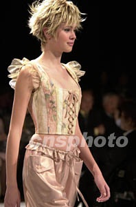 東京十一月舉行的二00三年春夏時裝展上,米黃系列的清爽短裝與發(fā)式膚色融為一體。作者:陶光雄