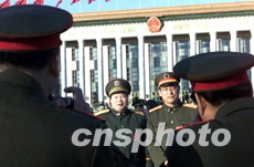 分別來自解放軍和武警部隊的兩名將軍代表,在北京人民大會堂前合影留念,他們共同出席在此間召開的中共十六大。作者:滿會喬