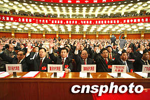 中國(guó)共產(chǎn)黨第十六次全國(guó)代表大會(huì)十四日上午在北京人民大會(huì)堂閉幕,主席臺(tái)上下舉手表決通過(guò)關(guān)于十五屆中央委員會(huì)報(bào)告等決議。中新社記者 毛建軍 攝