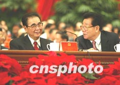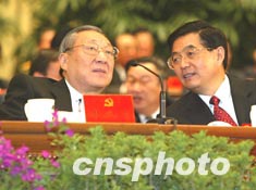胡錦濤與李嵐清在主席臺(tái)上交談。