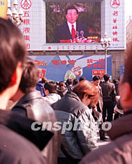 十一月十五日,新一屆中共中央政治局常委通過(guò)電視直播與民眾見(jiàn)面。北京火車(chē)站廣場(chǎng)的大屏幕前站滿(mǎn)了觀(guān)看直播的市民,胡錦濤出任總書(shū)記成為關(guān)注焦點(diǎn)。作者:張宇