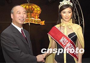 2002世界模特小姐大賽十八日(北京時間晨七時)在土耳其伊斯坦布爾舉行總決賽,代表中國參加此次大賽的模特閻巍小姐獲得冠軍。圖為頒獎儀式上中國駐伊斯坦布爾領事館總領事徐(左昆右鳥)向閻巍小姐表示祝賀。