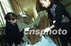 為紀(jì)念已故美國總統(tǒng)尼克松訪華三十周年,北京將于20日舉辦回顧中美關(guān)系發(fā)展史、展望未來的《走向和平與合作之旅》展覽。圖為尼克松圖書館的策劃人奧利維亞女士(左)和中方工作人員正在整理一九七二年二月尼克松總統(tǒng)訪華參觀長城時所穿的棕褐色大衣。作者:張勤