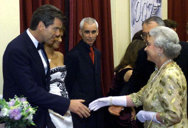 18日晚“007”新片《明日再會》首映式在倫敦皇家阿爾伯特禮堂隆重舉行。皮爾斯·布魯斯南、邦德女郎貝莉·哈瑞以及前幾任邦德的扮演者都參加了此次首映式。圖為英國女王伊麗莎白二世也親臨首映式。