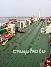 在二層寬闊宛如“小型航空母艦”的汽車甲板上,記者同樣看到了設計周密的捆綁裝置:那是一道道如履帶印的防滑道,加上一些十字槽口“地令”。一種汽動式捆綁裝置,一頭固定在汽車上,一頭卡在地令槽中,然后充氣拉緊捆綁,確保汽車在船舶十五度傾斜中無恙。