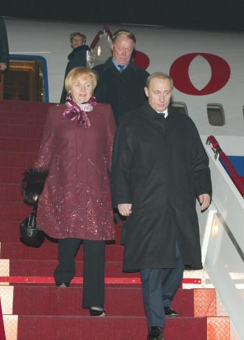 中國外交部副部長劉古昌、中國駐俄羅斯大使張德廣和夫人鄭淑蘭、俄羅斯駐華大使羅高壽等在專機舷梯旁迎候普京一行。普京總統(tǒng)夫人普京娜等陪同人員同機抵達。兩名中國女青年在機場向普京總統(tǒng)夫婦獻花。