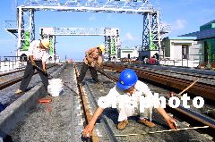 12月2日,隨著最后一根長25米的特制鐵軌,成功鋪設在粵海鐵路南港棧橋橋面,全長8738米的粵海鐵路南港棧橋鐵軌與?诨疖囌捐F軌接軌。至此,中國第一條跨海鐵路粵海鐵路南北港碼頭鐵路線全線貫通。圖為施工人員在南港棧橋上進行測量和鋪軌工作。古月 攝