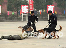 四日上午,湖南省公安系統(tǒng)舉行該省首次大規(guī)模多警種合成、模擬實戰(zhàn)反恐演習。圖為警犬搜捕演練中,巡邏民警和警犬聯(lián)合制服“歹徒”。作者:白祖偕
