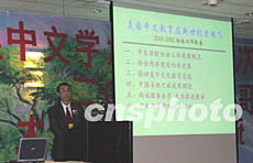 全美中文學(xué)校協(xié)會第四次全國代表大會十二月七日在芝加哥舉行,該會會員學(xué)校遍及美國四十一個州,學(xué)生五萬多名。圖為會長鄭良根在開幕式上以《美國中文教育在新世紀(jì)里騰飛》為題作工作報告,介紹協(xié)會工作情況和華文教育在美國的迅速發(fā)展。作者:趙海燕