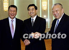 中新社北京十二月十一日電(記者 黃少華)國家副主席胡錦濤今天下午在人民大會堂福建廳會見了香港特別行政區(qū)行政長官董建華和澳門特別行政區(qū)行政長官何厚鏵。