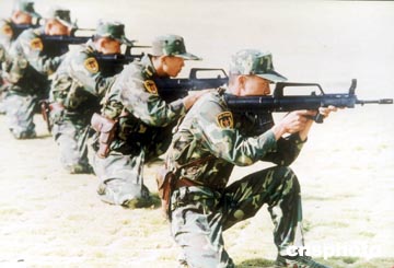 中國(guó)人民解放軍駐澳門部隊(duì)的官兵在廣東某基地使用國(guó)產(chǎn)新式?jīng)_鋒槍大練兵。作者:中新社