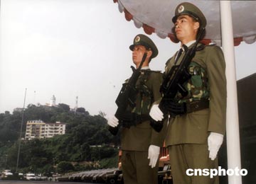 中國(guó)人民解放軍駐澳門部隊(duì)在古老的松山燈塔下站崗。作者:中新社