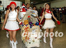 十二月二十日,香港機(jī)場(chǎng)購物廊圣誕慶祝活動(dòng)揭開序幕,圖為身穿美麗服裝的女孩們將圣誕禮品派發(fā)給旅客。潘索菲 攝