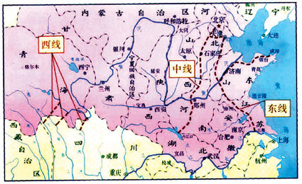 據(jù)我國的地形地貌特點(diǎn)、水土資源分布與組合狀況以及經(jīng)濟(jì)社會發(fā)展對水資源的要求,南水北調(diào)工程共分東線、中線、西線三條調(diào)水線,從而形成與長江、黃河、淮河和海河相互聯(lián)接的“四橫三縱”水網(wǎng)格局,達(dá)到我國水資源南北調(diào)配、東西互濟(jì)的優(yōu)化配置目標(biāo)。據(jù)介紹,這三條線工程最終建成后,到2050年調(diào)水總量規(guī)模為448億立萬米,接近于在黃淮海平原和西北部地區(qū)增加一條黃河的水量,可基本改變我國北方地區(qū)水資源嚴(yán)重短缺的狀況。