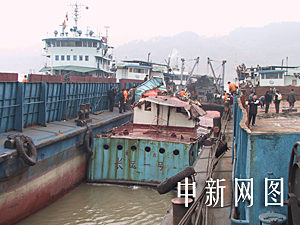 長壽特大海損事故沉船打撈工作目前已進行四天,今天下午沉船終于打撈出水,但警方在沉船內(nèi)未發(fā)現(xiàn)新的遇難者尸體。十八日上午七時二十分左右,長江重慶長壽水域發(fā)生特大海損事故,載有三十輛汽車的滾裝船宜盛號與一過江客運輪渡相撞,造成八人死亡,三十二人失蹤。雷鳴 攝