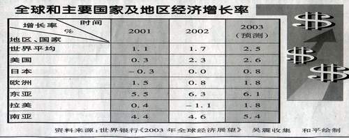 世行高級(jí)副行長(zhǎng)首席經(jīng)濟(jì)學(xué)家斯特恩在接受光明日?qǐng)?bào)記者專訪時(shí),對(duì)世界經(jīng)濟(jì)今年的特點(diǎn)進(jìn)行了具體分析。斯特恩說(shuō),“今年世界經(jīng)濟(jì)增長(zhǎng)率比人們年初的預(yù)期要低0.25%。世界經(jīng)濟(jì)今年的一大特點(diǎn)是美國(guó)、日本和歐元區(qū)的經(jīng)濟(jì)增長(zhǎng)同步放慢。具體分析起來(lái),他們衰退的原因既有相似的地方,也有不同之處。”