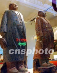 十二月二十六日,在香港街頭一家雕塑藝術(shù)店的櫥窗里,擺放著兩尊風(fēng)格別樣的毛澤東藝術(shù)像。中新社傳真 錢興強(qiáng) 攝