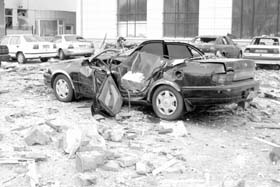 在現(xiàn)場采訪中記者注意到,在距高層50多米的路面上,一輛?吭诼愤叺霓I車前風擋玻璃被擊穿一個小洞,爆炸產(chǎn)生的巨大沖擊波將玻璃、塑料碎片揚到現(xiàn)場周圍,導(dǎo)致許多臨近樓房的玻璃破碎。