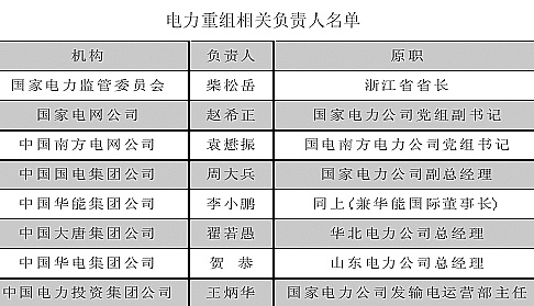 新成立的電力公司包括:國家電網(wǎng)公司和中國南方電網(wǎng)有限公司,以及中國華能集團(tuán)公司、中國大唐集團(tuán)公司、中國華電集團(tuán)公司、中國國電集團(tuán)公司、中國電力投資集團(tuán)公司等五家發(fā)電公司,和公司中國電力工程顧問集團(tuán)公司、中國水電工程顧問集團(tuán)公司、中國水利水電建設(shè)集團(tuán)公司和中國葛洲壩集團(tuán)公司等四家輔業(yè)公司。