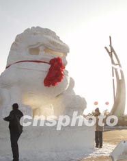 二零零三年長春凈月潭冰雪旅游節(jié)的游樂園準(zhǔn)備就緒,大型雪雕作品《雄獅》正在最后修飾,三十六個(gè)景區(qū)共有四百九十三件冰雪雕作品。作者:韓丹