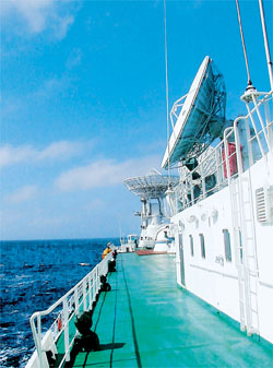 該船所在的海域,日出比北京晚2個(gè)小時(shí)。清晨,一陣急促的鈴聲響起,全體參試人員按部署就位,船上利用測控間隙組織了一次實(shí)戰(zhàn)演練。上午,當(dāng)高速飛行的“神舟”四號飛船再次光臨“遠(yuǎn)望”四號上空時(shí),船上的測控工作一切按預(yù)定程序進(jìn)行,廣大科技人員顯得有條不紊、游刃有余。