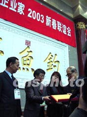 來自世界各地的華人企業(yè)家三日在北京釣魚臺舉行新春聯(lián)誼會。全國政協(xié)副主席孫孚凌(右一)到會為多名貢獻突出的華人頒發(fā)“華人企業(yè)家證書”。作者:王麗南