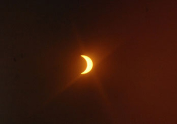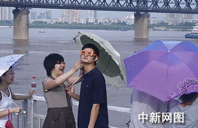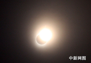 - 中新網(wǎng)記者銅陵報(bào)道::2009-7-22 09:35記者吳蘭報(bào)道:09:28,天空比剛才黑了些,人群中突然發(fā)現(xiàn)一陣歡呼,之間云縫中露出類似月牙狀的太陽。不過,幾秒鐘后,就被云層遮住。天全黑了,黑乎乎的。