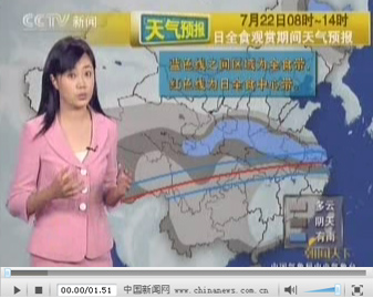 長(zhǎng)江流域今天上午將出現(xiàn)罕見日全食,寶島臺(tái)灣也能看到日偏食,民眾相當(dāng)期待,兩岸三地首次進(jìn)行聯(lián)合現(xiàn)場(chǎng)轉(zhuǎn)播。一大早,臺(tái)灣島內(nèi)的電視臺(tái)就開始通過直播報(bào)道,外派記者紛紛從成都、重慶、武漢、杭州等地發(fā)回報(bào)道,島內(nèi)觀眾通過第一時(shí)間如臨現(xiàn)場(chǎng)欣賞到日全食盛況。