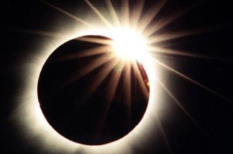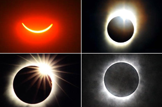 整個(gè)日食過程分五個(gè)階段,即初虧、食既、食甚、生光和復(fù)圓。(初虧:月球剛將太陽遮擋時(shí),是日全食的前奏曲;食既:月球剛將太陽完全遮擋時(shí),是全食精彩的開始;食甚:觀測(cè)地點(diǎn)進(jìn)入了月球影子的最深處 ;生光:太陽剛開始“露臉”,是全食的結(jié)束;復(fù)圓:太陽剛開始露出“圓臉”)。