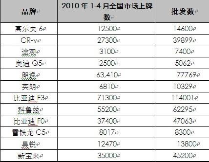 2010年1-4月上牌量與批發(fā)量比較圖表