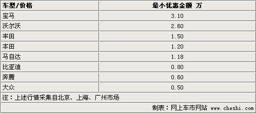 根據(jù)網(wǎng)上車市網(wǎng)站價(jià)格監(jiān)測系統(tǒng)顯示,以來自北京、上海、廣州三地城市為代表的上述8個(gè)熱銷品牌都出現(xiàn)了較大幅度的讓利優(yōu)惠。而另一方面國內(nèi)上半年的汽車生產(chǎn)量已經(jīng)超過800萬臺,國內(nèi)各大汽車交易市場和4S經(jīng)銷商處都出現(xiàn)了“庫存壓力”的報(bào)告。其中不乏BMW、沃爾沃這樣的高端品牌,而其它品牌多以大眾化品牌居多,它們當(dāng)中最小優(yōu)惠金額也在5000元以上至3.1萬元之間。
