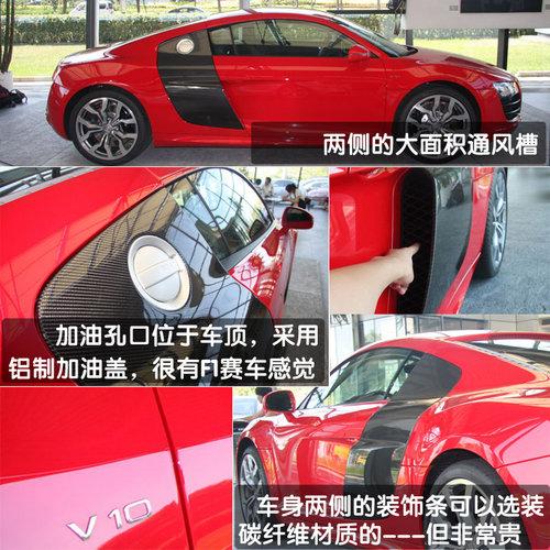 在車門后方,在輪拱和車頂之間,配有寬大的葉面?zhèn)瓤諝膺M(jìn)氣口,為V10發(fā)動(dòng)機(jī)的進(jìn)氣及冷卻提供足夠的風(fēng)量。側(cè)邊風(fēng)葉的漆面效果與車身的顏色配合得天衣無縫,當(dāng)然如果你有特別的需求和足夠的金錢,也可以把普通材料更換為碳纖維材料而那一定會(huì)很酷!此外,例如朱鷺白、幻影黑以及珠光效果等8種個(gè)性顏色,都是R8的可選外觀色彩。