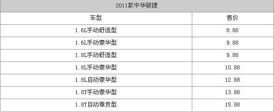 2010年7月8日,華晨中華正式推出了2011款駿捷車型,此次推出的新車共有7款不同配置的車型,分為1.6L、1.8L、1.8T三種動力調(diào)教。據(jù)悉,新車整體的售價區(qū)間為8.88-15.88萬元。