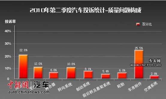 報告顯示,投訴統(tǒng)計(jì)的具體比例為:發(fā)動機(jī)占22.8%;變速器占12.0%;離合器占6.6%;轉(zhuǎn)向系統(tǒng)占10.8%;制動系統(tǒng)占8.1%;前后橋及懸架系統(tǒng)占5.4%;輪胎6.0%;車身附件及電氣占25.5%;空調(diào)系統(tǒng)2.8%。