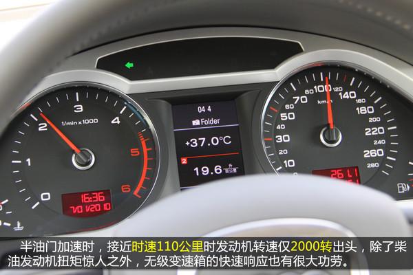 半程油門加速時,接近時速110公里時發(fā)動機轉速僅2000轉出頭,除了證明柴油發(fā)動機扭矩驚人之外,無級變速箱的快速響應也有很大功勞。在渦輪增壓器的加持下,發(fā)動機在1400~3500轉的區(qū)間持續(xù)發(fā)放380 Nm的最大扭矩,凌厲的加速表現就是最好的證明,官方數據百公里加速僅需8.8秒。