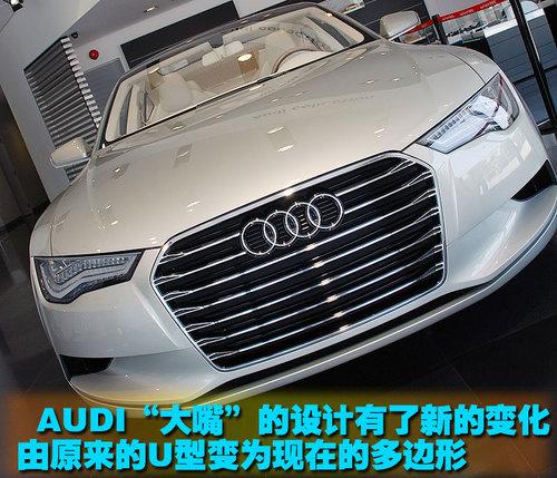 在正面特征上,概念車仍然具備奧迪標志性的的“大嘴”進氣格柵。但是略加觀察您也會發(fā)現這款概念車的進氣格柵又目前國產A6L的U型改變?yōu)榱祟愃朴诙噙吿菪蔚男螤。而“奧迪四個圈”的LOGO位置也設計的比較靠上而不是中間或是下方。