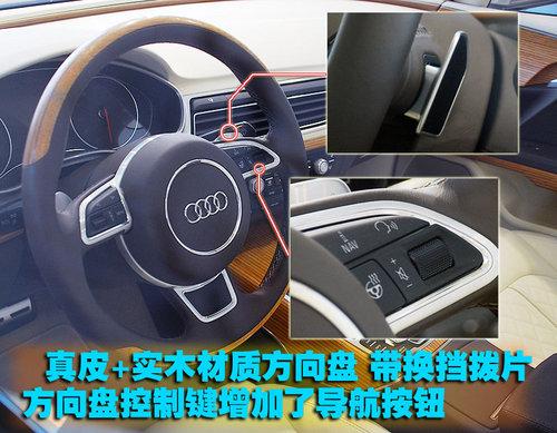 方向盤(pán)部分能夠看到奧迪專(zhuān)為跑車(chē)化而設(shè)計(jì)的三幅運(yùn)動(dòng)型方向盤(pán),通常A8的方向盤(pán)是更加舒適化的4幅方向盤(pán)。真皮縫制與實(shí)木材料的應(yīng)用是奧迪為豪華車(chē)市場(chǎng)專(zhuān)門(mén)打造的。在這里我們發(fā)現(xiàn)了以前奧迪并未在方向盤(pán)上安裝的“Nav”即導(dǎo)航按鈕。
