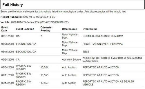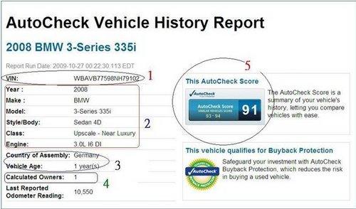 AutoCheck report與美國部份州的監(jiān)理所(DMV)有合作關(guān)系,因此如果您上美國監(jiān)理所(DMV)的網(wǎng)站,監(jiān)理所都會(huì)建議您在買車的時(shí)候,一定要檢查AutoCheck報(bào)告,在AutoCheck報(bào)告可能可以提供您買車的重要參考資料-如經(jīng)歷多少任車主,里程數(shù)為何,何時(shí)何地掛牌,是否有出過交通事故,車籍資料是否干凈(如Lemon car, Salvage or Junk title),等等歷史資料。另一份也一定要了解的是CarFax。