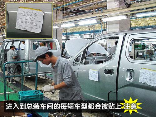 進(jìn)入鄭州日產(chǎn)生產(chǎn)車間前,工作人員要求我們把戒指、手表等利器全部摘掉,以免在參觀時(shí)刮傷車漆。車間里的每輛車的車身都被貼上注意 磕碰 劃傷的貼紙,更加明顯的提醒了工作人員工作時(shí)要小心。