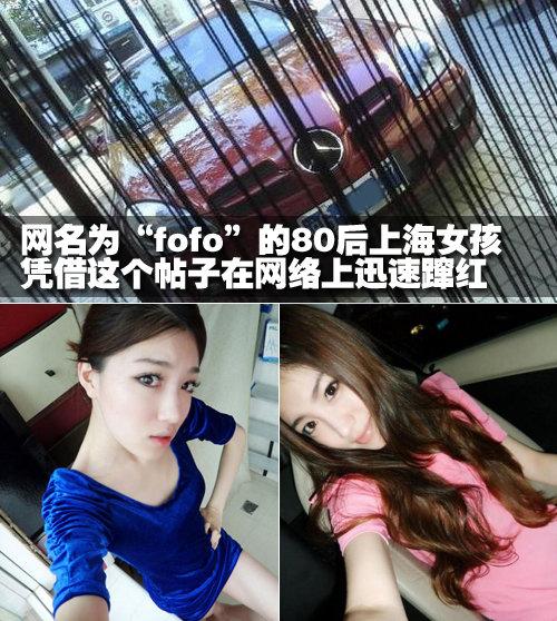 一個(gè)網(wǎng)名為“fofo”的80后上海女孩在某知名論壇中發(fā)帖《曬曬我的大奔,你們有嗎?!》,并且貼出了不少靚照,曬自己的奔馳SLK和奢靡生活。就這樣一個(gè)帖子,在短短2小時(shí)內(nèi)被蓋到100樓,點(diǎn)擊率高達(dá)了近10萬,并被很多網(wǎng)友轉(zhuǎn)載到各大論壇,成為最熱點(diǎn)的帖子。