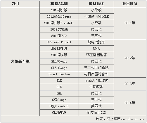 雖然奔馳全新一代CLS轎跑車將在巴黎車展發(fā)布,但是正式上市還要等到明年,而在2012年奔馳全新一代CLS雙門轎跑車也將推出。而已在國內(nèi)投產(chǎn)的奔馳新C級轎車將于明年推出小改款車型,在2014年將陸續(xù)推出全新一代C級轎車以及酷派和旅行版車型。此外,作為奔馳入門級SUV的BLK車型將于2013年正式推出,從進(jìn)一步抗衡寶馬X1等競爭車型。