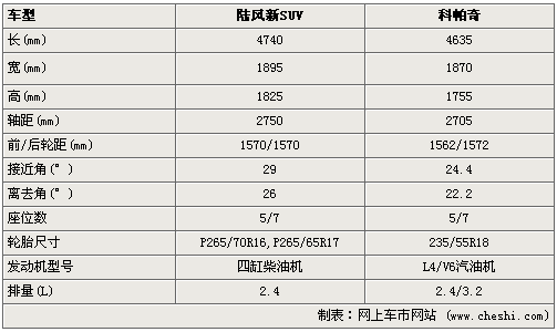在車身尺寸上,江鈴陸風SUV長4740mm、寬1895mm、高1825mm,軸距為2750mm,與科帕奇相比略大一些。在比較重要的越野指標上,陸風SUV接近角為29度、離去角26度。在動力上,陸風SUV搭載2.4L四缸柴油機,有5座和7座兩種內(nèi)飾設計。