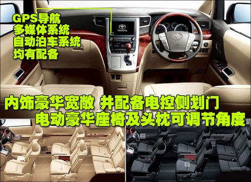 在配置方面,豐田Alphard高配版配備了電動控制的側滑門、中置式大型電動天窗、內(nèi)置GPS導航及硬盤的多媒體系統(tǒng)、6碟DVD/CD影音系統(tǒng)帶8喇叭、自動泊車系統(tǒng)、前后泊車雷達。車廂內(nèi)飾則提供了米色與黑色兩種內(nèi)裝顏色供用戶選擇。