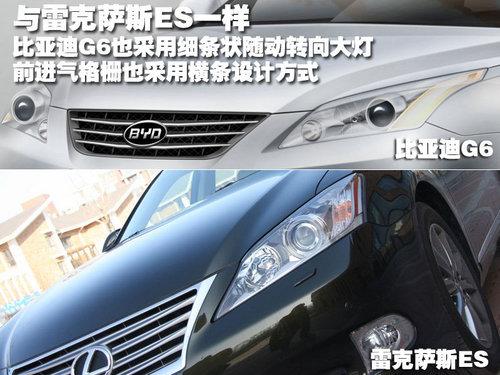 比亞迪G6的前臉是與雷克薩斯ES最為相似的地方,從圖片中可以看到,比亞迪G6的前臉進(jìn)氣格柵采用橫條貫穿,設(shè)計方式與雷克薩斯ES一模一樣。所不同的是,雷克薩斯ES的進(jìn)氣格柵采用質(zhì)感十足的四個鍍鉻條,而比亞迪G6只采用3個裝飾條,顯得有幾分單薄。