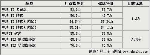 據(jù)4S店銷售人員介紹:目前奧迪TT已上市的典藏版車型店 內(nèi)有現(xiàn)車,售價(jià)為53.9萬元,TT標(biāo)準(zhǔn)版車型有現(xiàn)車,售50.9萬元,但還有2款在50.9萬元基本款車型上增配車型,分別售54.54萬及55.31 萬,以上這4款車型都可優(yōu)惠1.2萬元,車身顏色共有白色、紅色、銀色及日光橙色供挑選。奧迪TT典藏版相對(duì)在售TT車型不同的是,這款車配以橘色車身及 運(yùn)動(dòng)套件,車內(nèi)車外都進(jìn)行運(yùn)動(dòng)改裝,看起來十分漂亮。如需預(yù)定TT及TTS其他顏色及車款,需等待4-6個(gè)月時(shí)間,由于是按照車主需求定制車型,所以等待時(shí)間較長。